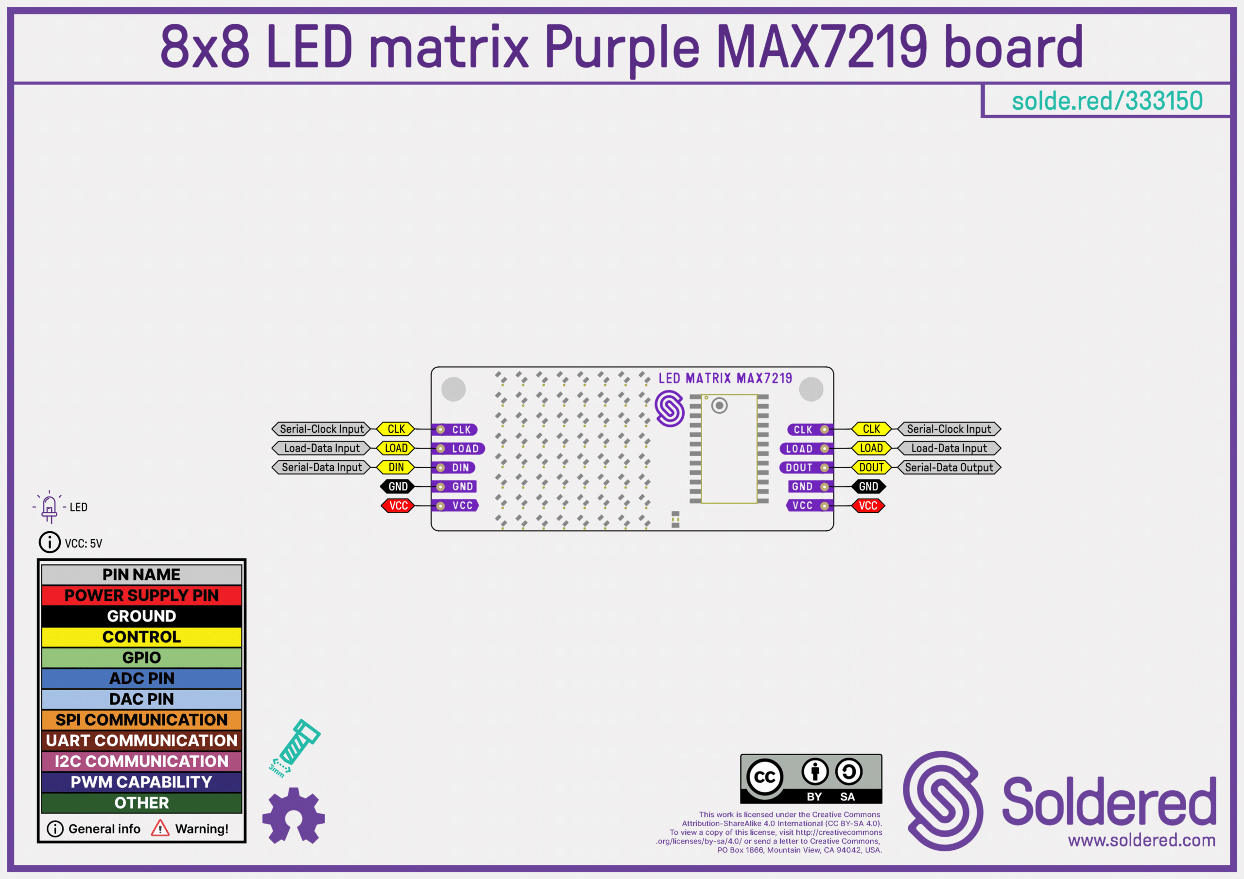 LED-Matrix 8×8 ist ein System von 64 miteinander verbundenen LEDs, die mithilfe von LED Treiber MAX7219 so leuchten, wie sie programmiert wurden; das alles befindet sich auf einer Platte und ist wirklich einfach für Verwendung. Sie können sie für Buchstaben-, Symbol-, Textanzeige u.ä. verwenden. Es ist möglich, mehrere Module mit nur ein paar Drähten zu verbinden und mehrere Matrizes gleichzeitig zu steuern.