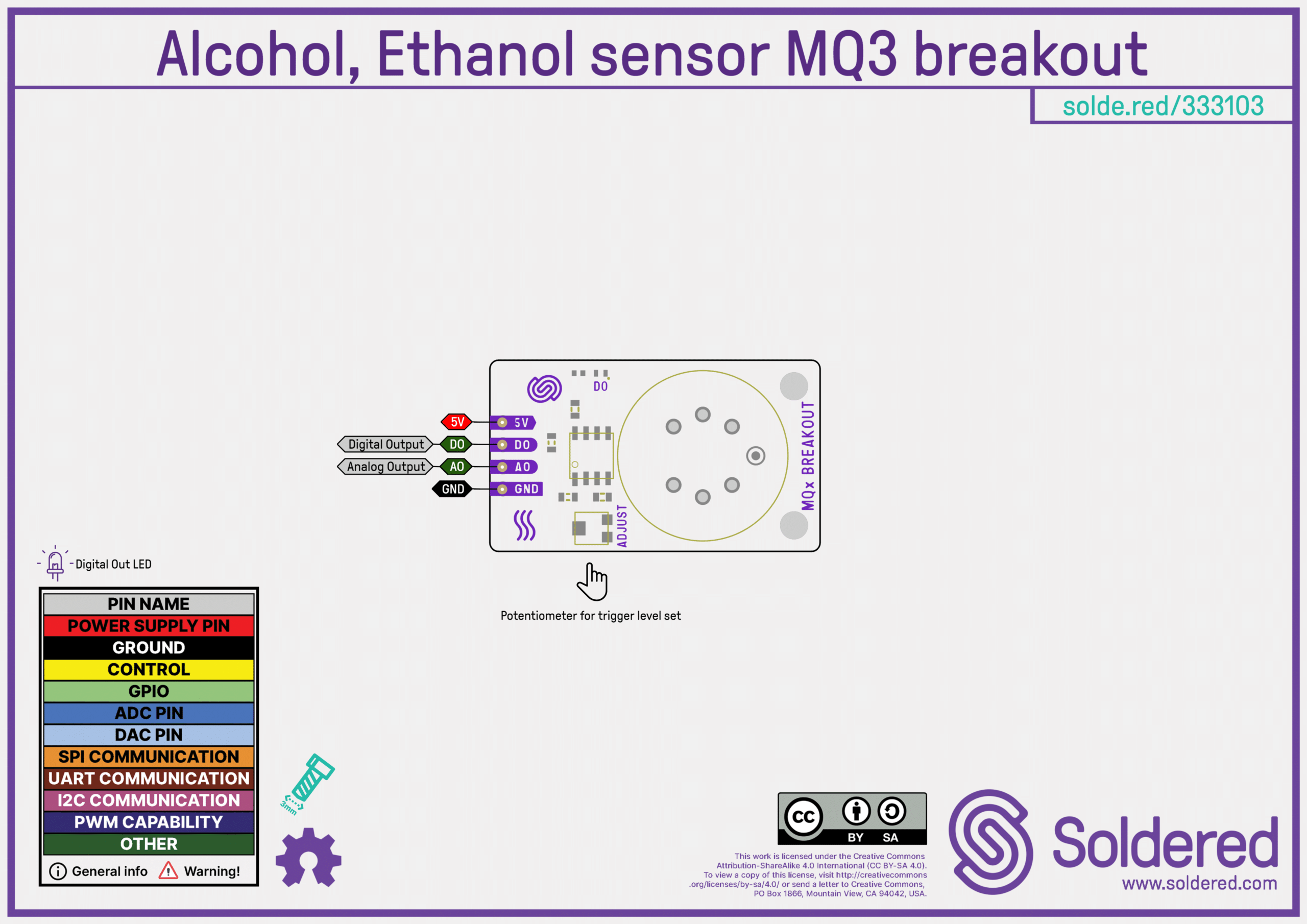 Die breakout Platte arbeitet mit digitalen (DO) und analogen Signalen (AO). Digitalen Output bekommt man mit der Installierung der Grenzwerte mit dem Potentiometer. Der analoge Output variiert je nach Gasintensität um den Sensor herum.