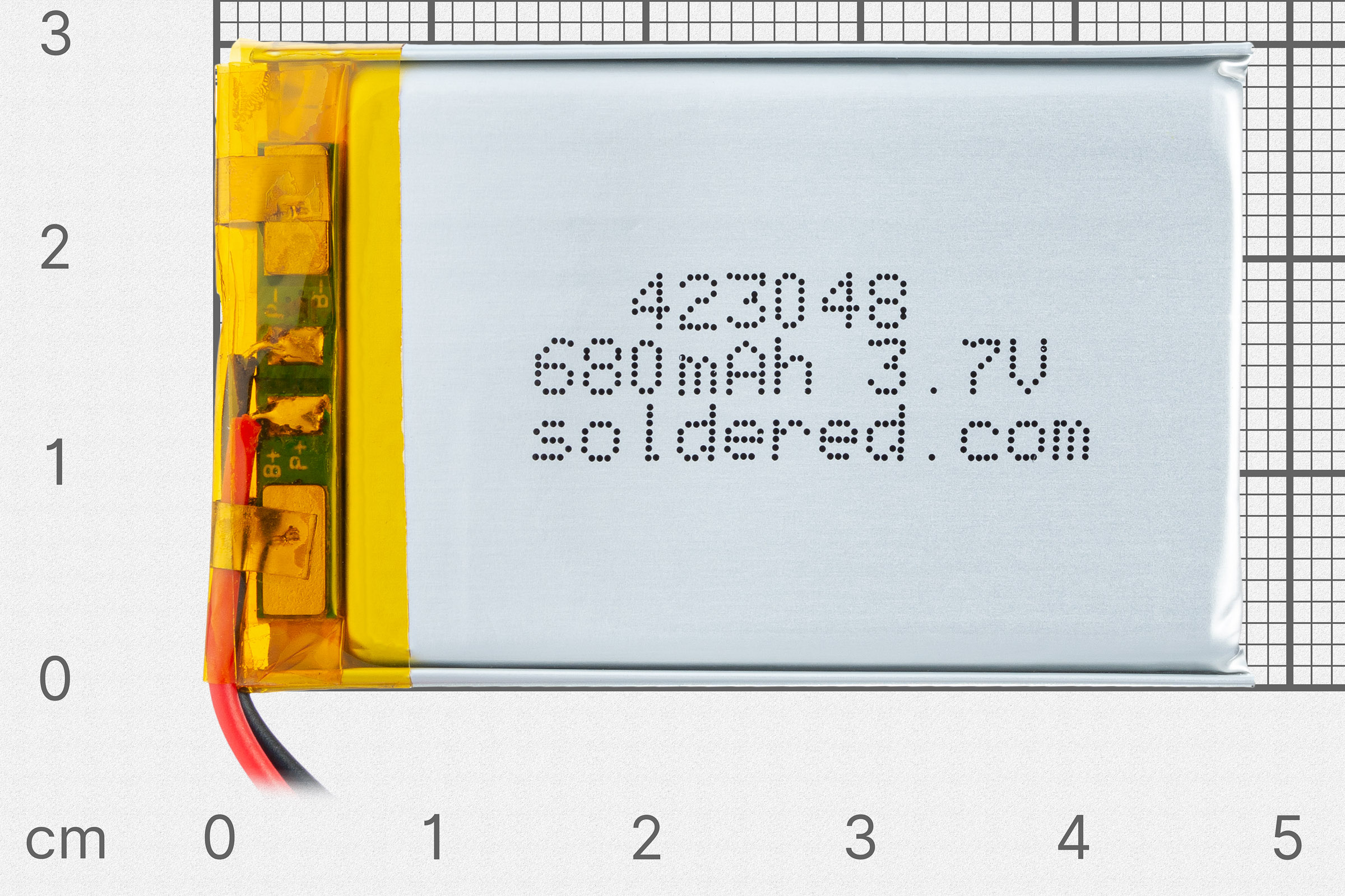 Dieser Lithium-Akku ist klein, leicht und ausdauernd! Er wird dir durch die gewöhnliche JST Buchse die Nennspannung von 3,7 V geben, was deine Projekte Tag und Nacht betreiben wird. Darüber hinaus hat dieser Akku ein eingebettetes Schutzsystem vor der zu großen Spannung (es verhindert die Überladung) und Kurzschluss. Damit schützt es den Akku, versichert ihm längere Laufzeit, aber es schützt auch dich vor Gefährden dieses Akkus!