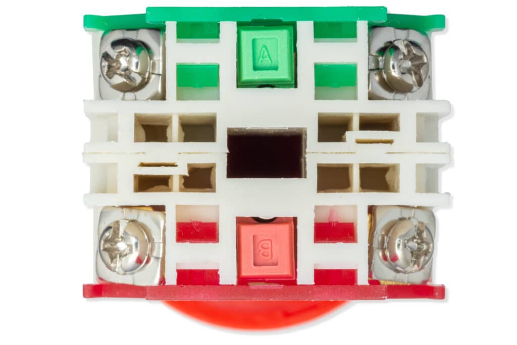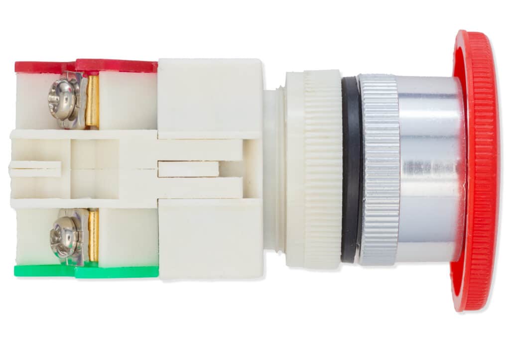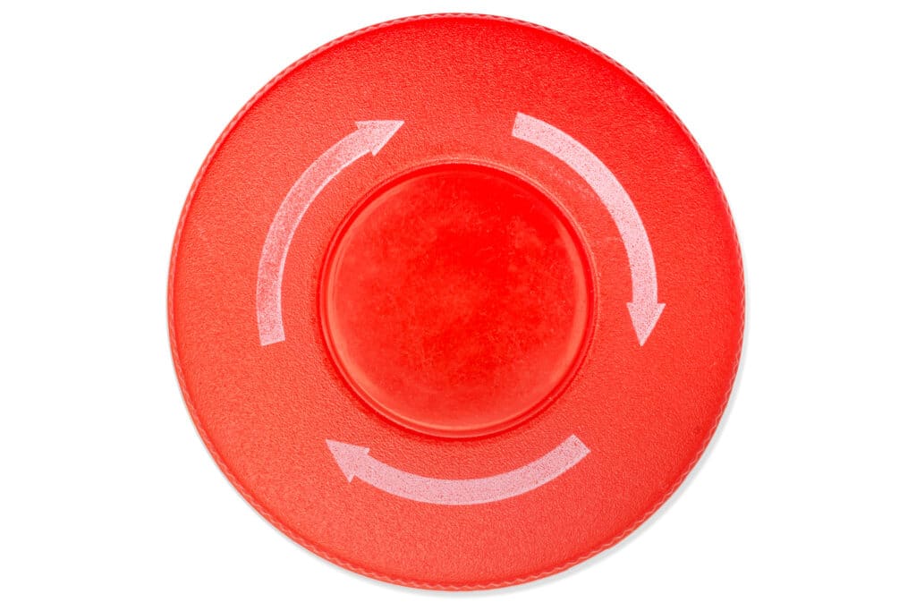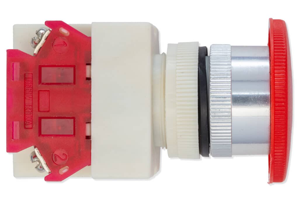 Alle echte Maschinen enthalten einen emergency stop button – die Taste, die den Betrieb der gesamten Maschine stoppt. Sie kann im Fall der Gefahr für ein Mensch, der an der Maschine arbeitet, sehr nützlich sein. Wenn du wünscht, etwas ähnliches auf dein Projekt einzubauen, hier bieten wir diese Taste an!