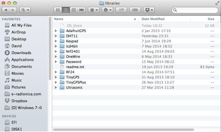 Pokazat ćemo to na primjeru DHT11 librarya**link za preuzimanje** na Mac OS X i Arduino IDE 1.0.5. Isti postupak može se primjeniti i na ostalim OS i novijim Arduino IDE.