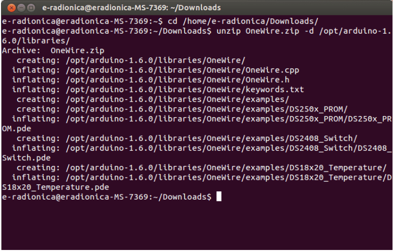 Ovo će promjeniti ime .zip file u “OneWire.zip”, nužno jer naziv librarya mora biti ASCII. Zatim ćemo unzipati i kopirati novi .zip file u arduino libraries, naredbom:
