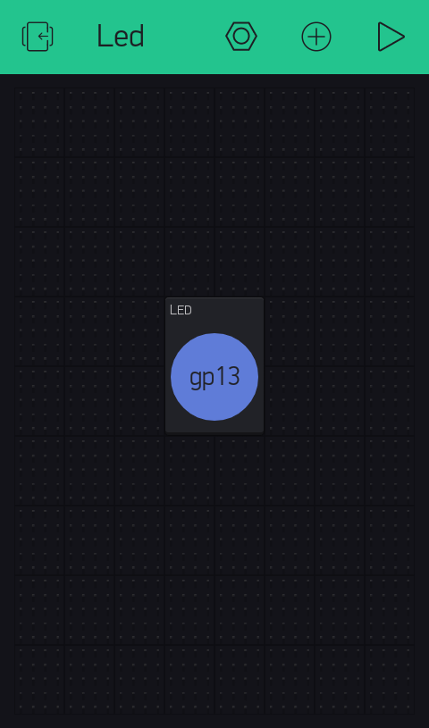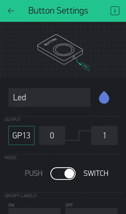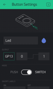 Kliknite na gumb kako bismo podesili postavke. U postavkama možete preimenovati gumb u što želite, nazovimo ga „Led“. Pod Output promijenite „PIN“ u „GP13“, na taj način spajamo gumb na pin 13 Dasduino Connect te ga pomoću istog palimo ili gasimo. „Button“ ima 2 moda, push i switch mod. Gumb će u push modu biti ON jedino dok ga pritišćem, kada otpustimo stanje se mijenja u OFF. Da si to olakšamo promijenite mod u „Switch“, na taj način možemo samo jednim pritiskom mijenjati stanje gumba.