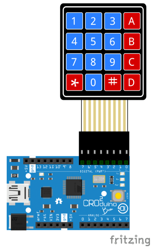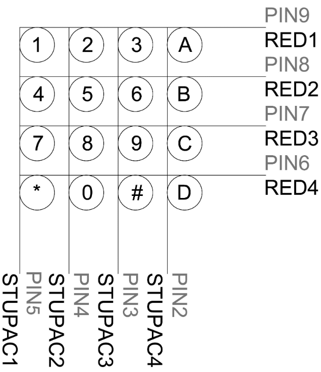 Matrix membranska tipkovnica koristi kombinaciju 4 reda i 4 stupca kojom se definira pojedina tipka mikrokontroleru, Dasduinu. Fizički ispod svake tipke nalazi se pushbutton s jednim krajem spojenim na red, a drugim na stupac. Ove konekcije možete vidjeti na slici ispod: