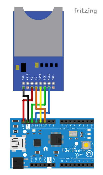U ovom tutorijalu naučit ćemo kako sa Dasduina spremati podatke na SD karticu pomoću modula za SD karticu. Modul za SD karticu nam omogućuje spajanje SD kartice do 32GB na Dasduino te na nju možemo spremati razne podatke koji su nam bitni i kasnije ih obrađivati na računalu ili ponovno koristiti na Dasduinu. S ovim modulom možemo i čitati podatke sa SD kartice te ih ispisivati na LCD display ili koristiti za neku drugu funkciju.