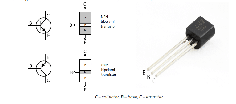 Na desnoj slici vidimo raspored nožica za jedan npn bipolarni tranzistor. To nije uvijek tako i svakako provjerite datasheet vašeg tranzistora.