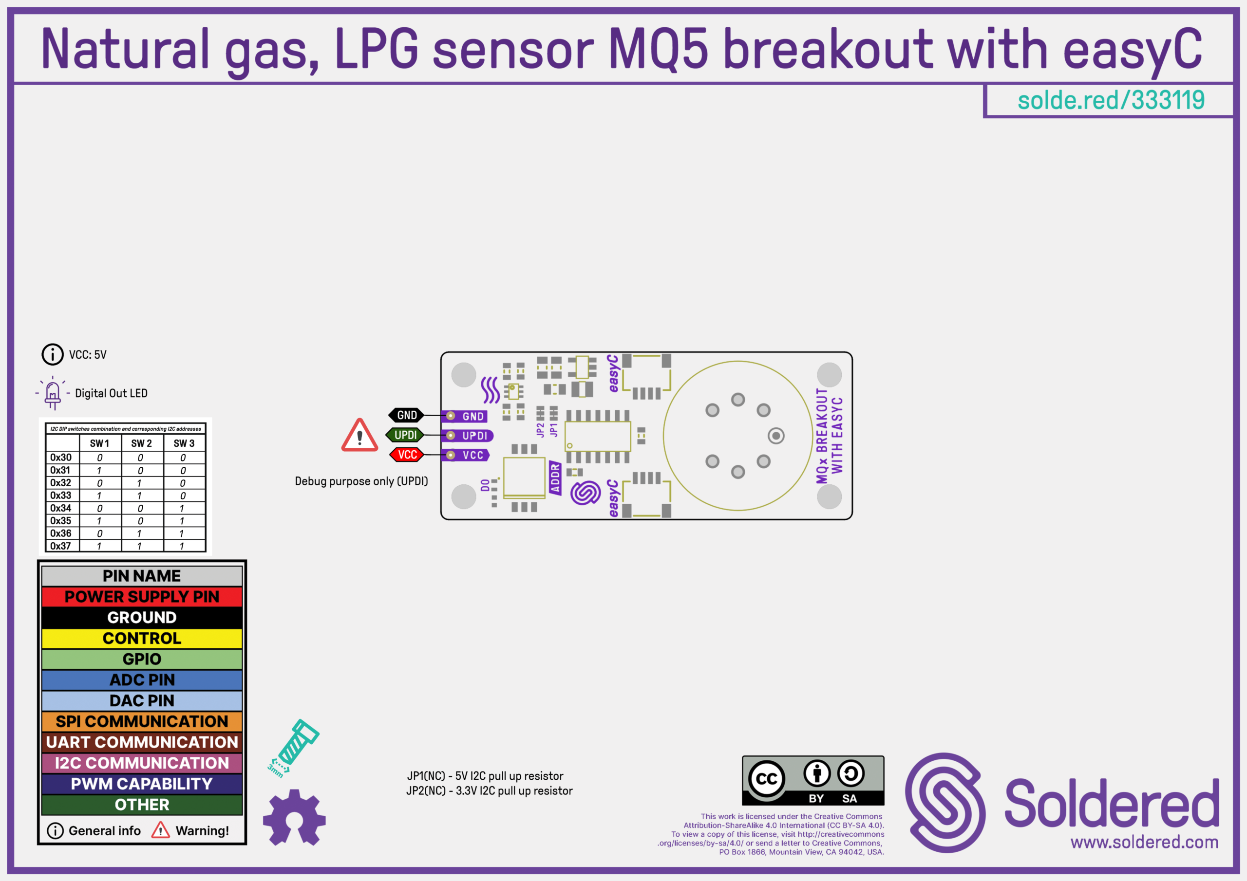 Kada se detektira plin, LED dioda će početi svijetliti. Ostaje isključena ako ništa ne detektira. Četiri montažne rupe omogućuju lako montiranje na površine. Pločica dolazi s tri muška headera.