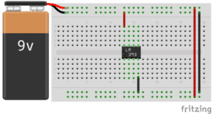 Since we want the LED diode to light in the dark, the Output pin will be connected to the cathode(-) of the LED diode, while we will connect the anode (+) over 330Ω to + 9V.