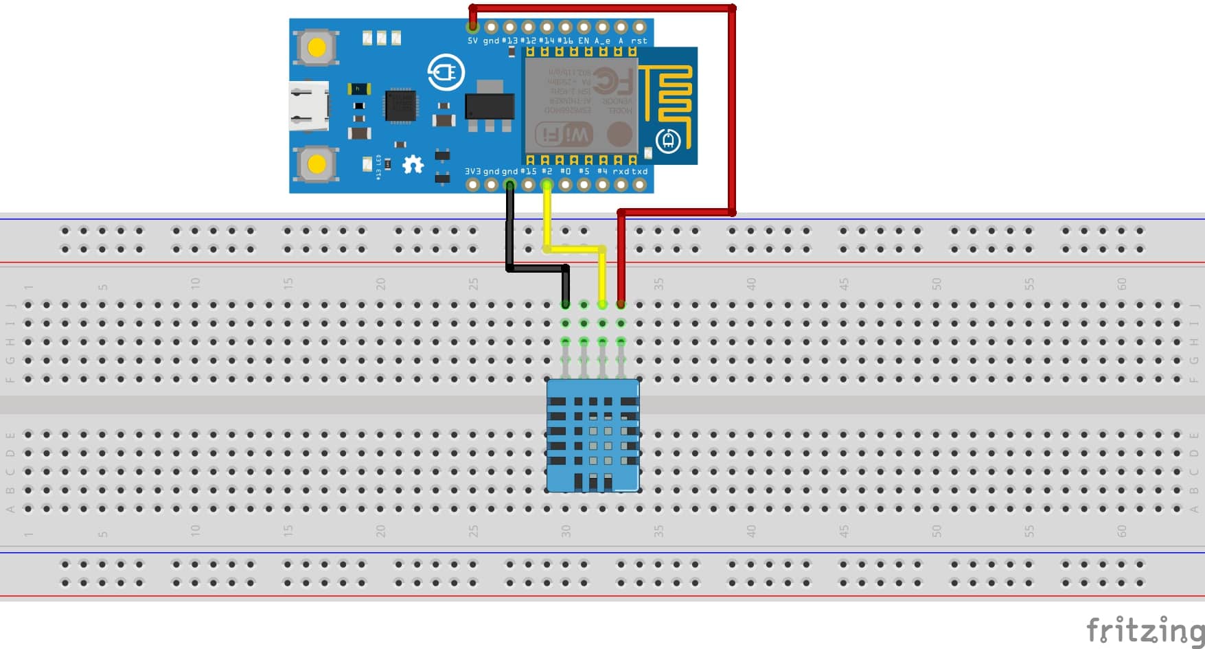 In this example, we will measure temperature and humidity using the DHT11 sensor. Read more about the sensor here.