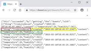 //including the ESP8266WiFi library that allows working with WiFi on the ESP8266 module#include "ESP8266WiFi.h"//including the DHT library that allows working with the DHT temperature sensor#include "DHT.h"//setting the SSID and the password of the network we are connecting toconst char* ssid = "SSID_network";const char* password = "Password";//defining the pin to which we connect the DHT sensor#define DHTPIN 5//defining the type of sensor we are using (DHT11 or DHT22)#define DHTTYPE DHT11//DHT library constructor DHT dht(DHTPIN, DHTTYPE, 15);//setting the host to which we send the dataconst char* host = "dweet.io";void setup() { //starting serial communication (115200 baud) Serial.begin(115200); delay(10); //starting communication with the DHT sensor dht.begin(); Serial.println(); Serial.println(); Serial.print("Connecting to "); Serial.println(ssid); //connecting to the network whose data we have entered in the beginning WiFi.begin(ssid, password); //up until we have connected, the while loop is executed so that we won't continue further execution of the code until we have connected to the network while (WiFi.status() != WL_CONNECTED) { delay(500); Serial.print("."); } //displaying that we are connected on the Serial monitor, printing the IP address Serial.println(""); Serial.println("WiFi connected"); Serial.println("IP address: "); Serial.println(WiFi.localIP());}void loop() { Serial.print("Connecting to "); Serial.println(host); //using the WiFiClient class to create the TCP connection WiFiClient client; const int httpPort = 80;//setting the port to 80 //connecting to the host (the page that we have entered in the beginning) //if we weren't able to connect, go back to the void loop if (!client.connect(host, httpPort)) { Serial.println("connection failed"); return; } //saving the humidity reading from the sensor to the h variable int h = dht.readHumidity(); //saving the temperature from the sensor to the t variable int t = dht.readTemperature(); //sending the request to the host, and within that request, we send the temperature and humidity readings from the sensor //if we want to send another parameter to the host, we need to add the following line to the request //behind the String(h) + we add ( "&name_oftheparameter=" + String(variable)+) //in the end, after all the variables, there must be " HTTP/1.1\r\n" ... //to the Internet browser, we enter https://dweet.io/get/dweets/for/CroduinoNova2 (instead of CroduinoNova2 we can enter the name we want to //but then we search it using that name) client.print(String("GET /dweet/for/CroduinoNova2?temperature=") + String(t) + "&humidity=" + String(h) + " HTTP/1.1\r\n" + "Host: " + host + "\r\n" + "Connection: close\r\n\r\n"); delay(10); //reading all the lines of the host's answer and displaying them on the Serial monitor while(client.available()){ String line = client.readStringUntil('\r'); Serial.print(line); } //displaying that the connection is closed on the Serial monitor Serial.println(); Serial.println("closing connection"); //10 second pause delay(10000); }
