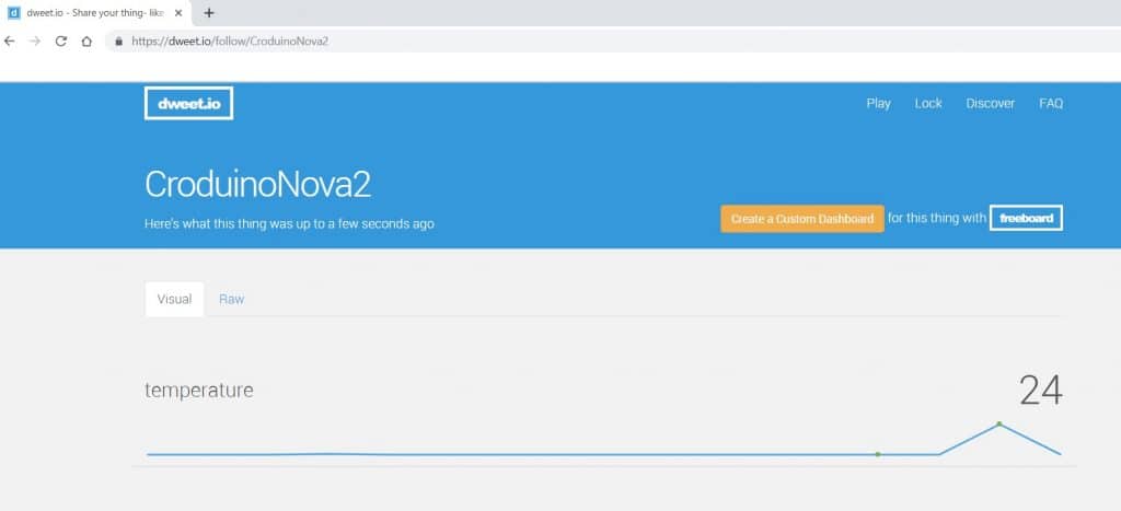 Dweet.io also allows us to graphically display the data we send from our sensors. In order to get a graphical display of the information we sent to dweet.io, we only need to enter the following address to the Internet browser: https://dweet.io/follow/OurName (since we use DasduinoConnect in the name example, our URL will be https://dweet.io/follow/DasduinoConnect) and the information we sent to dweet.io will be graphically shown under the name DasduinoConnect. An example of a graphical representation of the temperature we send to dweet.io with Dasduino Connect is shown in the image.