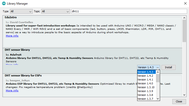 The Library Manager window will pop up. A list of installed or ready-to-be-installed libraries will show. Above it will be two dropdown menus and a search bar. With the first dropdown, you can search the libraries with type, such as updatable, installed, Arduino, recommended, etc. The second dropdown menu is to filter out the topic of the library, like communication, device control, display, sensors, etc. In the search bar, you can type a search term such as a name, and you’ll get filtered results. In this example, we will be using a DHT11 sensor Arduino Library.