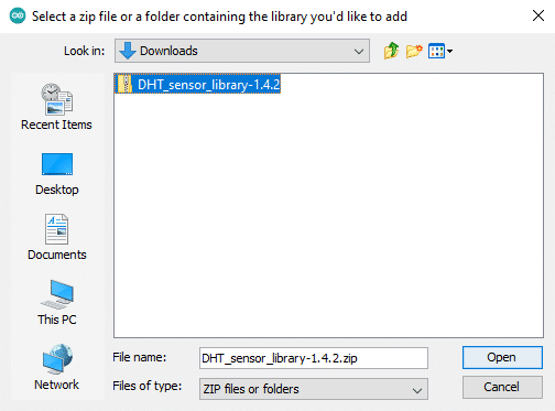 Navigate through the directories to find it, click on the .zip file you’ve downloaded earlier, and open it. Your Arduino IDE will show a message “Library added to your libraries. Check ‘Include library’ menu”. You can find thereafter your newly installed library under Sketch > Include Library.