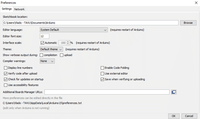 Before doing anything with the downloaded file, you’ll first need to find the location of your sketchbook folder. You can do so by going to File > Preferences on the Arduino IDE. The menu that pops up should look something like this.