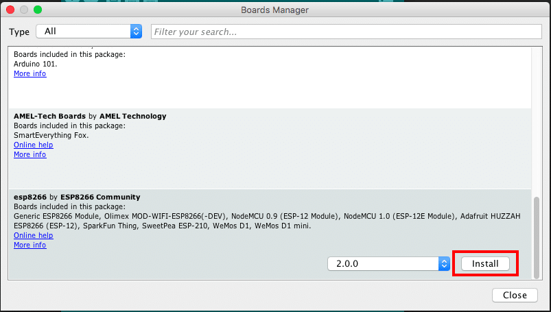 STEP 4: There is esp8266 by ESP8266 Community at the bottom of the list, as last. Choose as version 2.0.0(or the newest in the moment of your installation) and click on Install.