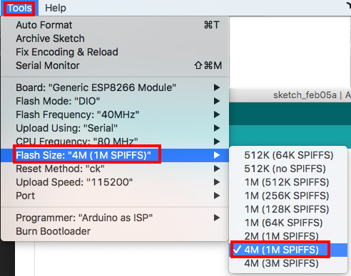 STEP 6: Now, under Tools->Board we have many options. The last change we need to make is under Flash size, choose 4M (1M SPIFFS).