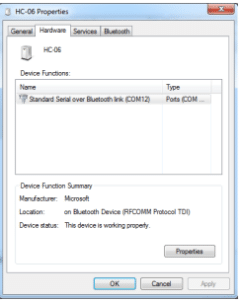 Now you should see the HC-06 device in the BT devices list. Right-click on the device, select Properties, and the Hardware tab. On it, you will find a virtual port which is assigned to the device. The example in the picture below is the COM12 port. The same can be found on the Services tab.