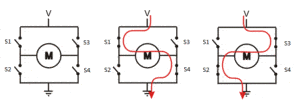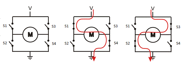 L298N driver for motor uses the so-called H-bridge integrated chip. H-bridge is a circuit which consists of 4 switches connected to the motor in a way shown in the image below. If we close S2 and S3 switches, and open S1 and S4, the current will flow in a certain direction. If we shift states of switches so that the S2 and S3 are open, and S1 and S4 closed, the current will flow through the motor in the opposite direction. Besides, we must not close all four switches at once or both switches on one side of the H-bridge (e.g. S1 and S2) because it would induce a short circuit.