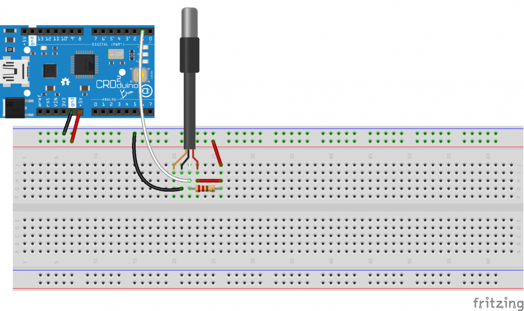 Connecting is very simple since we only need to connect three wires and one 4,7kΩ resistor. The red wire of the thermometer is connected to Dasduino’s +5V power supply, and the black wire to the GND. The data wire can be connected to any digital pin. Between the data wire and +5V it is necessary to connect a pull up resistor. We have chosen digital pin 1 in this example, which we will later on use in the program code. The connection scheme is shown in the following picture.