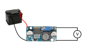 Connecting this module is very simple, all four connectors are indicated on the board. Anyway, we must watch out not to change the polarity since the module does not have a protection diode. In this example, we have connected a 12V battery, and a voltmeter which we used to observe the output voltage, on the output. Voltage is adjusted using the variable resistor on the board.