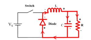In the first case, the switch is closed and current flows through the coil, loads it with magnetic energy and the voltage drops on the coil. The voltage on the output will be lower just because the coil behaves differently in AC conditions, e.g. when some changes, such as switching, occur in the network. In this case, the coil will not be a short circuit as in DC conditions; rather, it will have a certain impedance which causes the voltage to drop. However, if we keep the switch closed for too long, the coil will get saturated and voltage on the output will be equal to the source voltage. That is why we have to open the switch quickly in order to get a lower voltage. If you are not interested in what is the use of each component, but you only want to understand the basic work principle, skip to the 2. SECOND CASE.