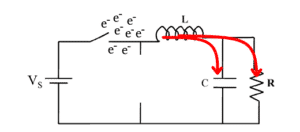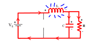 At the moment of turning on the switch, a voltage spike on the capacitor will occur. The capacitor, at this point, is in a short circuit to DC current if it is empty. It is going to be empty because it is drained by the resistor (load) connected in parallel, which means very large current from the source (in theory infinite). In practice, this is a bit different because there are different resistances of the elements themselves: internal voltage source, serial capacitor resistance, resistors’ resistance, etc. Therefore, the capacitive loop looks milder in practice but is certainly not desirable and it is likely that something will be destroyed. By adding the coil, we limit the current and branches, and then we have a current load (not the voltage).