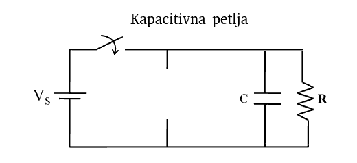 At the moment of turning on the switch, a voltage spike on the capacitor will occur. The capacitor, at this point, is in a short circuit to DC current if it is empty. It is going to be empty because it is drained by the resistor (load) connected in parallel, which means very large current from the source (in theory infinite). In practice, this is a bit different because there are different resistances of the elements themselves: internal voltage source, serial capacitor resistance, resistors’ resistance, etc. Therefore, the capacitive loop looks milder in practice but is certainly not desirable and it is likely that something will be destroyed. By adding the coil, we limit the current and branches, and then we have a current load (not the voltage).