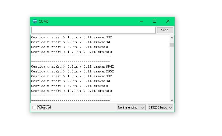 For the Serial monitor from Dasduino, we use the CTRL+SHIFT+M shortcut within the Arduino IDE program. After that, the Serial monitor, using which we will receive information from our sensor, opens.