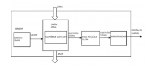 The sensor uses the laser scattering principle, i.e. it produces dispersion using a laser for radiation of the suspended particles in the air and then harvests that light to a certain degree until we finally get the scattering light variation curve. Lastly, we have the equivalent particle diameter and the number of particles with different diameters per volume unit that can be calculated using a microprocessor based on the MIE theory.
