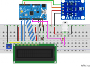 The connection of the module is very simple, since it uses the I2C communication, and the module itself has everything necessary for the proper operation of the sensor. In the image below, you can see the scheme for sensor connecting. If data is to be displayed on the LCD, it is necessary to connect a 16×2 LCD, but if the data is to be displayed on the Serial Monitor, the LCD and trimmer connection to adjust the contrast on the LCD is not required. Also, if no measurement correction is desired, so that humidity and temperature (in this example via DHT22 sensor) are measured, it is not necessary to connect it. The trimmer that is used is 10kOhm, as well as the resistor for the DHT22 sensor.