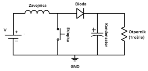 Let’s imagine a situation when the circuit switch is open (not connected). When we connect the voltage source to the circuit, current will flow through the coil that converts a part of energy into magnetic energy. That same current flows through the diode that ensures the correct current direction and results in the capacitor being charged and the load having an ensured voltage source. Let’s now imagine that we have closed the switch. What will happen? The capacitor will remain charged because of the diode which prevents it from emptying, but what about the coil? The coil is connected with the voltage source into the short circuit and after some time, it would burn out. This can be prevented by closing the switch for a very short period of time, short enough not to cause a short circuit, but long enough for magnetic field not to disappear. Now the coil will convert the part of magnetic energy back into the electric energy and “add” voltage to the circuit. This way, the resistor (load) will have the ensured electric energy source of higher voltage than the one connected in the circuit.