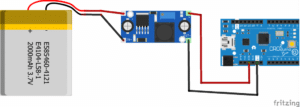 Connecting the module to Dasduino or any other load is very simple. The module contains 4 connectors symbolically named IN+, IN-, OUT+ and OUT-. It is necessary to connect the power source (e.g. battery) to the “IN” connectors in the right way where the plus (+) of the battery should be connected to “IN+”, and the minus (-) to the “IN-” connector. “OUT +” and “OUT-” are the output voltage connectors which can be connected to Dasduino. Before connecting with Dasduino, it is necessary to connect the multimeter to “OUT +” and “OUT-” and turn the small trimmer (small “screw” on the blue component) to adjust the value of the desired output voltage. By turning it in one direction, we increase the voltage and, by turning in the other direction, we reduce the voltage. For this example, we will set the output voltage value to 7.5V. We connect “OUT+” to the VIN pin and “OUT-” to one of the GND pins. After that, Dasduino will work the same way as if we have connected it with the USB cable. The picture below shows the exact connection of the module.