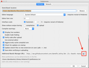 You will now need to add the URLs that Arduino Boards Manager will use. Click on File-> Preferences (Ctrl +,) and click on the icon at the bottom of “Additional Boards Manager URLs”.
