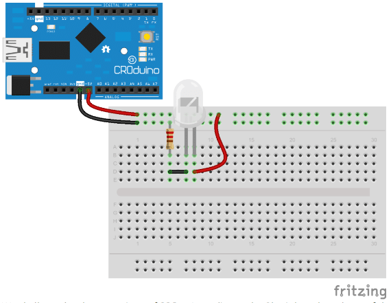 The same calculation for the value of the resistor could be made if we counted the voltage on the resistor only. We know that the source voltage is 5V(Dasduino), and the LED consumes 2.5V. If we deduct it, Uiz – Uled = 5V – 2.5V = 2.5V, we are left with 2.5V which need to be “consumed” on the resistor. Let us apply the Ohm’s law on the resistor, we know that the current is 20mA, R = Ur / I = 2.5V / 0.02 = 125Ω.