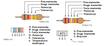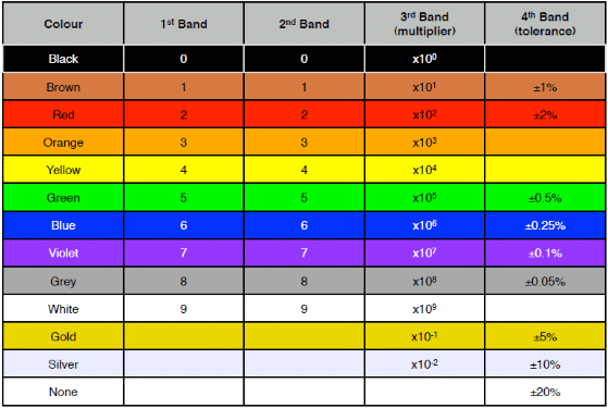 When using a resistor it is necessary to know the amount of its resistance and the maximum amount of dissipation power. The resistance amount is indicated on the resistor and most commonly with four or five colored rings. Each color of the ring stands for a certain value and meaning, which can be seen from the picture: