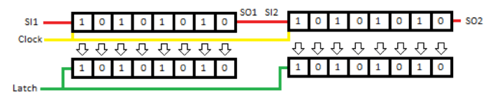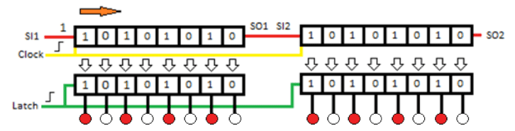In the picture above we can see two serial-connected registers, so the 3 outputs of Dasduino are extended to 16. In such a connection, the serial input of the first register (SI1) is a common input, while the input of the second register is connected to the output of the first one. The clock pins of both registers are connected in parallel as well as the latch pin. So connected registers behave like 16-bit.