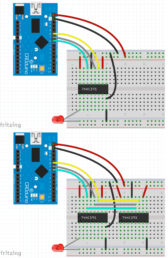 Let’s suppose this “theory” is not interesting and we want to hook up the shift register at Dasduino as soon as possible to start programming. We’ll simply connect pins from Dasduino and shift register like shown in the picture, copy the attached code and use it for whatever we want. Let’s take a look at connections of one or more shift registers with Dasduino.