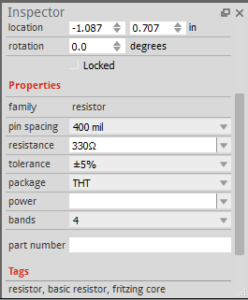 According to the markings on the resistor we see that it is 220Ω, so let’s change it to 330Ω. We select it by clicking on it with left mouse button, and the box will appear around it (as shown above). This action will open us Inspector tab under the Parts tab that we’ve already used. In the same tab, under Properties – change 220Ω resistance to 330Ω.