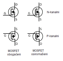 There are two different types of MOSFET transistors: P (engl. positive) and N (engl. negative) channel MOSFET. Their function is the same, but primarily they differ in the internal structure. P-channel MOSFET‘s internal structure is made so that the conductive channel is made out of P type, while the N-channel MOSFET‘s conductive channel is made of N type. For proper operation of the P-channel MOSFET it is necessary to bring negative voltage to the control electrode (Gate). For the N-channel MOSFET it is necessary to bring positive voltage to the control electrode (Gate), in order for it to function properly. The image below shows the internal structure of P and N-channel MOSFET.