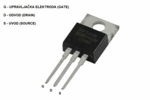 MOSFET (engl. Metal–Oxide–Semiconductor Field-Effect Transistor) is a name for a special type of unipolar FET (engl. Field Effect Transistor) transistor. MOSFET has three pins better known as Source, Drain and Gate. Source and Drain are electrodes derived from layers of semiconductor which are connected into the so-called “channel”. Using the control electrode (Gate), we control the flow of current on that channel. MOSFET transistor’s main feature is the fact that, unlike bipolar transistors which are current-controlled, MOSFET is voltage-controlled. This means that, the current flow (between Source and Drain electrode) is being controlled by certain amount of voltage brought to the Gate electrode of MOSFET. It is enabled by adding a special thin layer of oxide material, most commonly silicon dioxide (SiO2 – primary glass-making material) around the control electrode, by which it is electrically isolated from the “channel”.