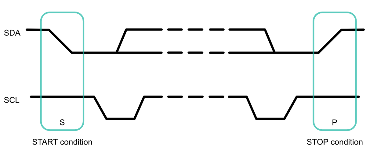 Both SCL and SDA lines can be either low or high. The start condition (marked S) will occur when the SDA line drops low while the SCL line is still high. At the end of the message, the stop condition (marked P) will occur when the SCL line goes or is high, and the SDA line goes high after that. Start and stop bits are unique signals that can only be generated by a controller, and never by a peripheral.