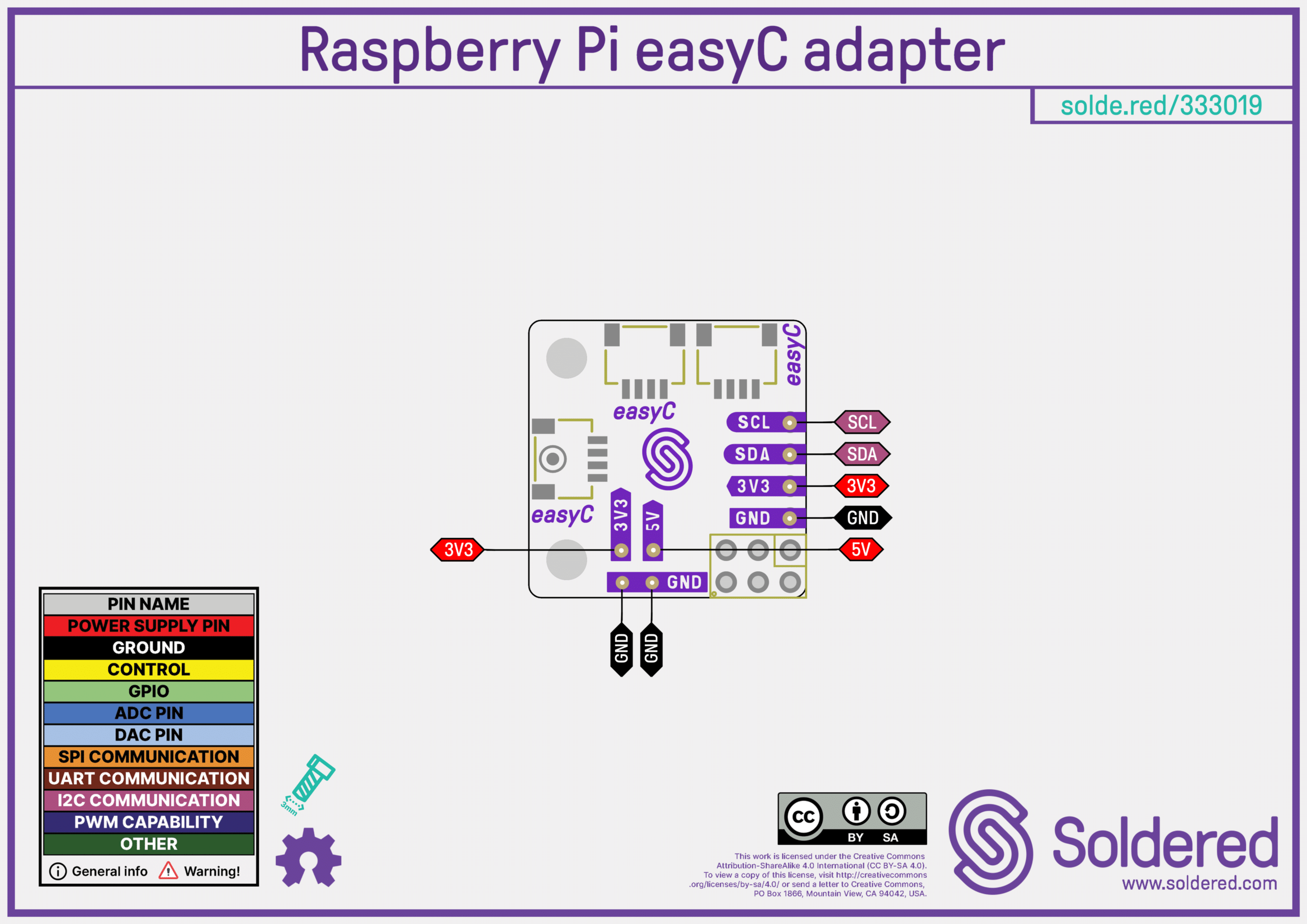 This adapter makes it easy to connect easyC devices and sensors to the Raspberry Pi. It has 3 pieces of easyC connectors and a female header for Raspberry Pi, next to the header there are pins for connecting 5V and 3.3V and ground pins. It simply connects to the Raspberry Pi because its pinout matches the pinout of the Raspberry Pi.