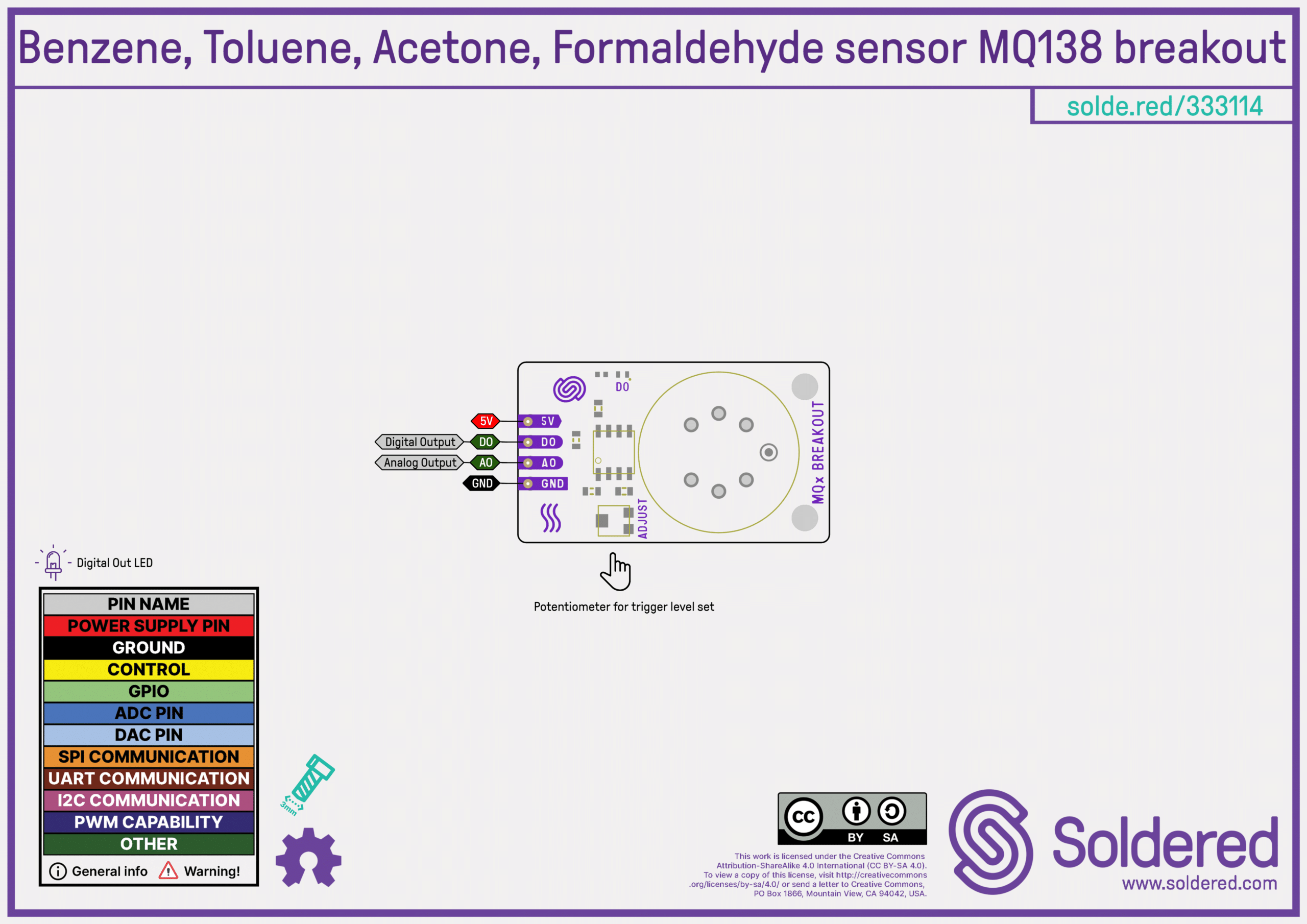 The breakout board works with both digital (DO) and analog signals (AO). The digital output is obtained by setting a threshold value with a potentiometer. The analog output will differ depending on the intensity of the gas.